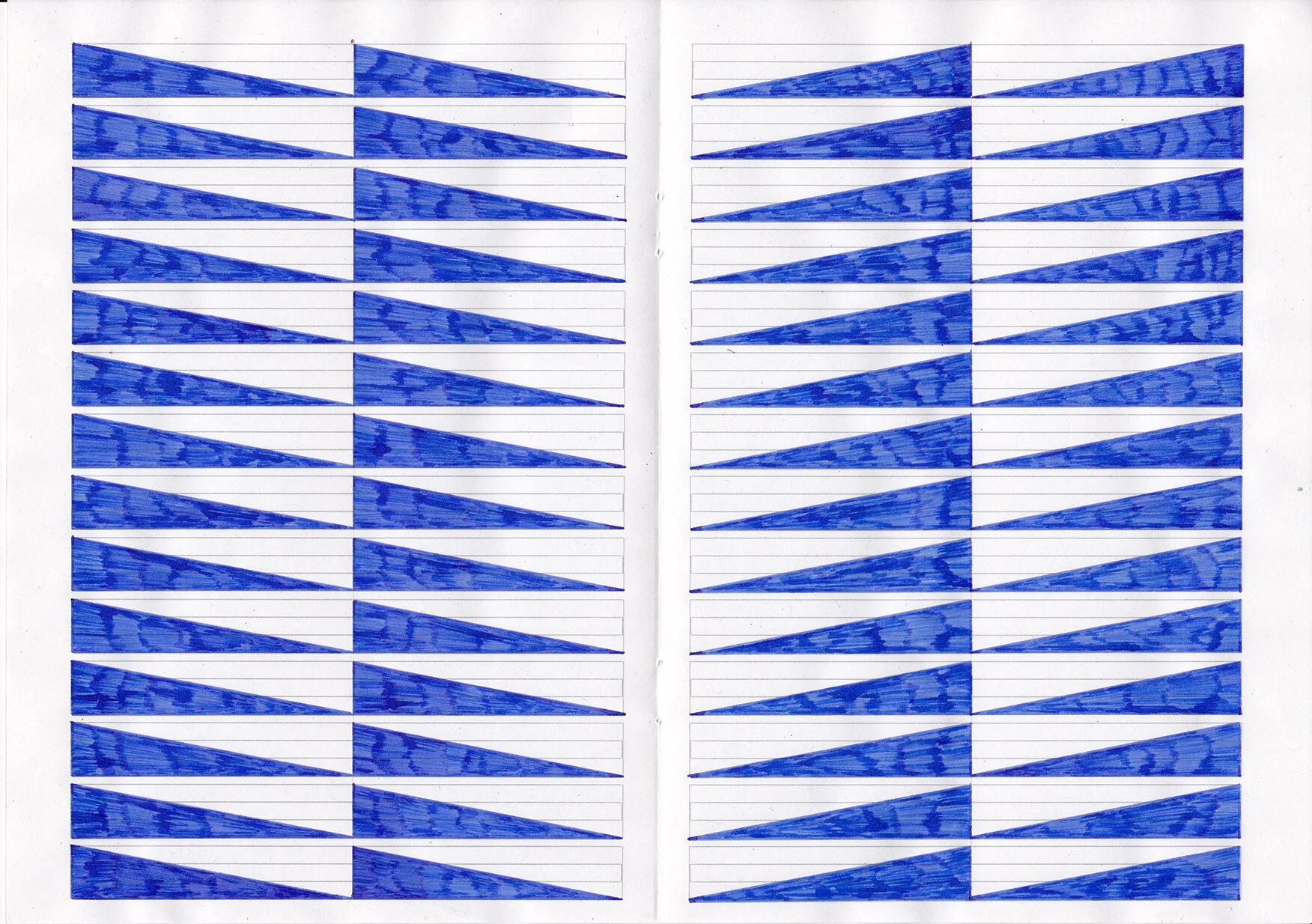 Die geometrischen Muster ergeben sich aus den drei unterschiedlichen Lineaturen der Schreibhefte, gezeichnet in sich wiederholender, serieller Form, die einzelnen Muster symmetrisch auf den gegenüberliegenden Heftseiten angeordnet. Auf jeder Doppelseite erscheint ein anderes Muster, jeweils gezeichnet mit einem Schulfüller und blauer Tinte.